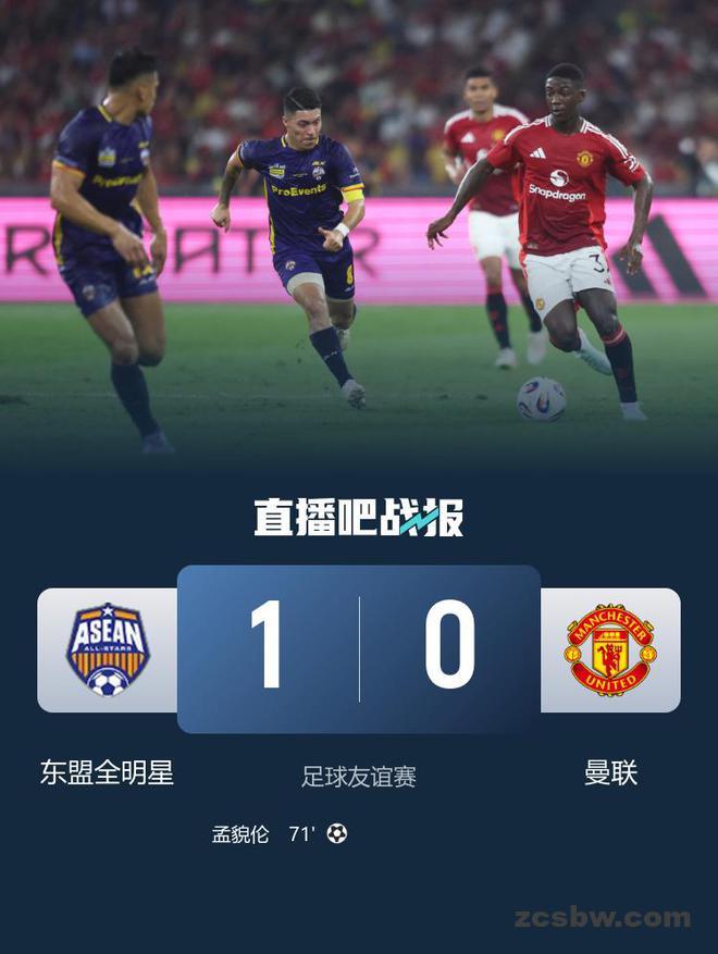 直播吧5月28日讯 北京时间5月28日晚20时45分,2025年足球友谊赛展开角逐,曼联对阵东盟全明星。上半场红魔33分钟连换4人,下半场加纳乔替补登场,曼联71分钟丢球,缅甸球星孟貌伦制胜。最终曼联0-1不敌东盟全明星+全场仅3射正,72550名观众现场见证,红魔下场友谊赛将对阵中国香港。