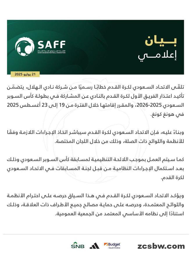 雷速体育7月21日讯 沙特足协官方发布公告,确认利雅得新月退出了8月份的中国香港沙特超级杯。 正文如下 沙特阿 […]