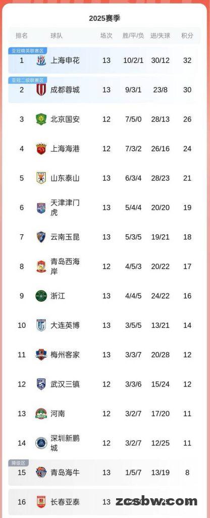 闪电体育5月17日讯5月17日,中超第13轮,除新鹏城vs三镇延期外,其余场次均战罢。最新积分榜已经更新,申花获胜2分领跑,十人蓉城战平西海岸位列第2,国安遭海牛补时绝平落后榜首6分位列第3,海港战平泰山,两队相差3分仍位列4、5名。