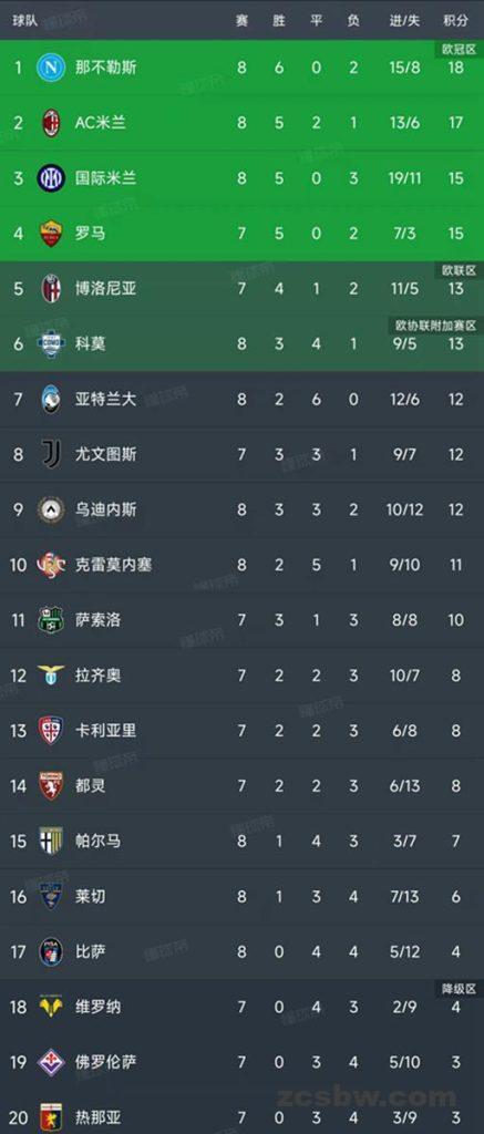 北京时间10月26日,意甲第8轮结束了5场比赛,最新积分榜如下!