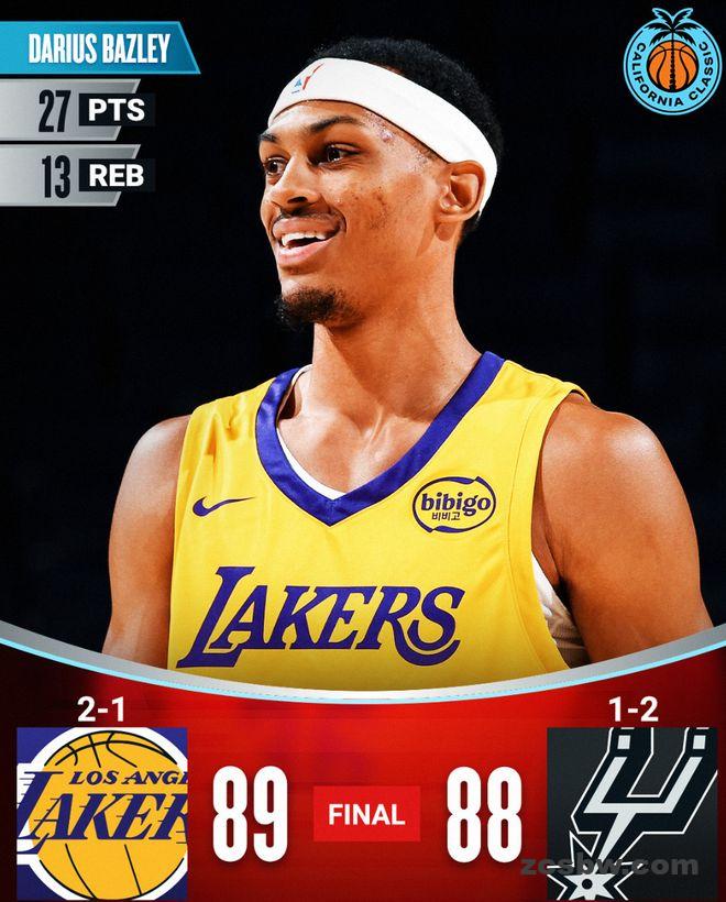 北京时间7月9日,NBA夏季联赛加州经典赛湖人对阵马刺,马刺榜眼哈珀继续缺席。克内克特前两场低迷后迎来强势回暖,但湖人持续遭马刺压制最多落后14分差距。湖人在贝兹利与克内克特引领下强势反扑,贝兹利完成暴力补扣准绝杀,最终湖人89-88逆转险胜马刺收获2连胜,湖人本站赛事2胜1负,马刺1胜2负。