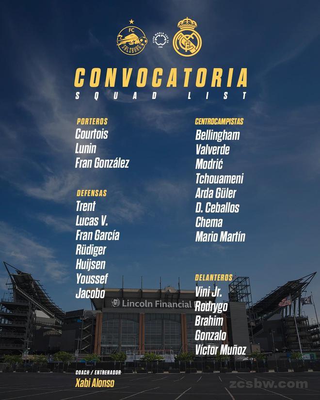北京时间6月27日9时,皇家马德里将在世俱杯小组赛末轮对阵萨尔茨堡红牛。皇家马德里方面公布了球队此役的大名单,贝林厄姆领衔,姆巴佩仍然缺阵。
