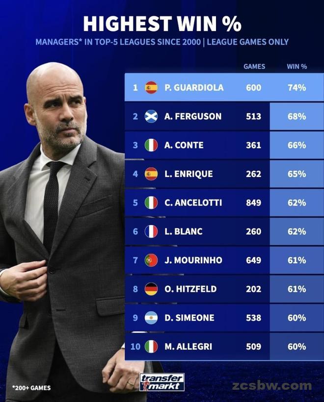 说明:自2000年起,仅统计五大联赛,且执教场次≥200场。