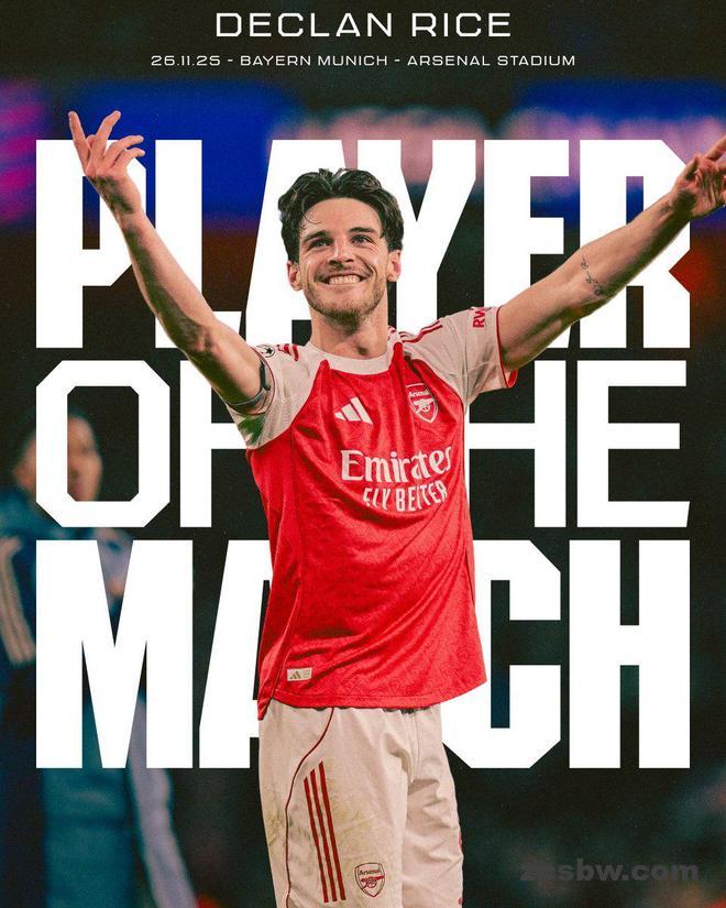 在今天凌晨进行的欧冠联赛阶段第5轮比赛中,阿森纳主场3-1击败拜仁,赛后,赖斯被阿森纳官方评为本场比赛队内最佳球员。