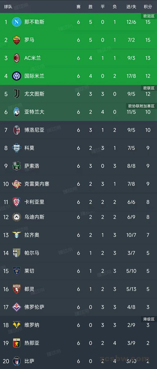 北京时间10月6日,随着那不勒斯2-1逆转热那亚,尤文0-0闷平AC米兰,意甲第6轮结束了所有比赛,最新积分榜如下!