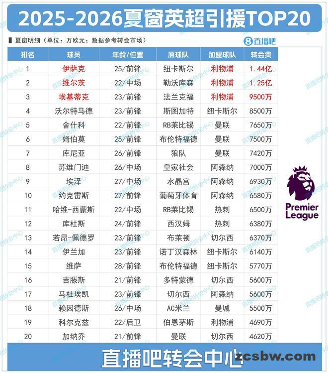 英超20队夏窗评级: